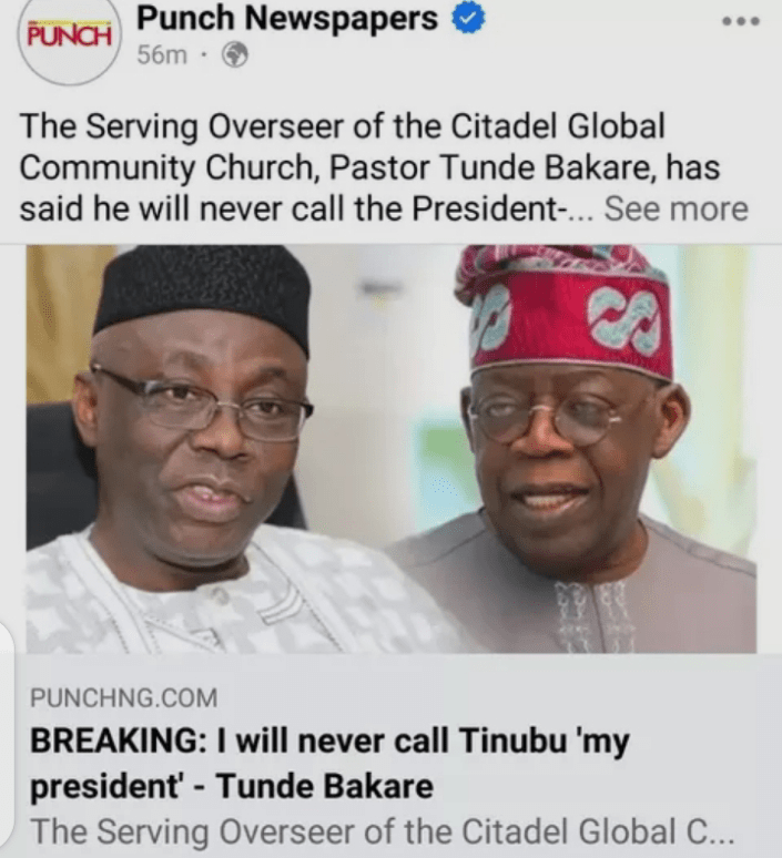 The serving overseer of citadel global community Church pastor Tunde Bakare, has said he will never call president- elect, Bola Tinibu his president.